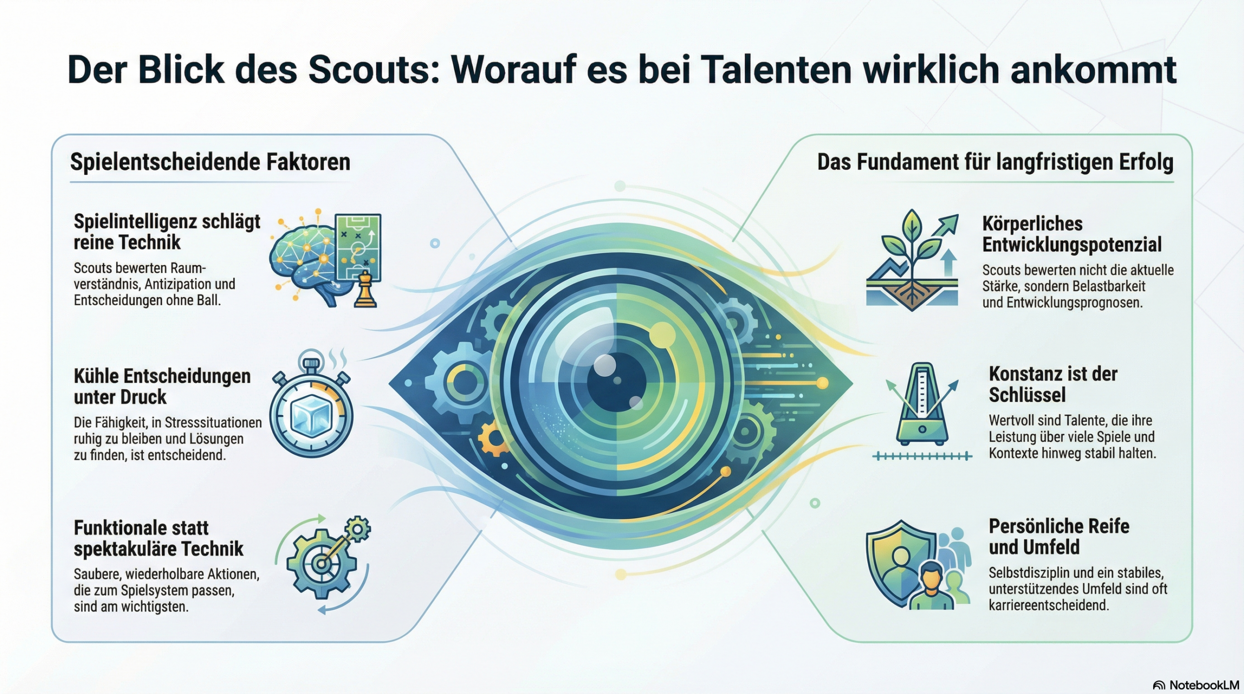 Scouting ist weit mehr als das Beobachten von Toren, Pässen oder Zweikämpfen. Es ist eine komplexe Analyse aus Spielintelligenz, Technik, Entscheidungsverhalten, körperlicher Entwicklung, Mentalität und persönlicher Reife. Scouts suchen nicht nach dem besten Spieler des Tages, sondern nach Athleten, die sich kontinuierlich verbessern und langfristig das Potenzial für höhere Aufgaben besitzen.